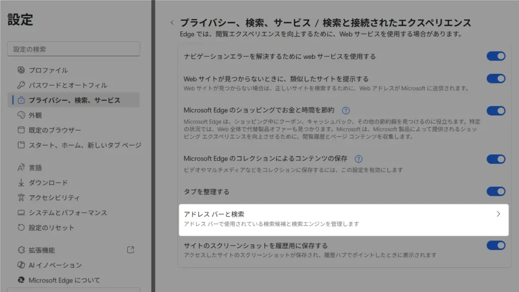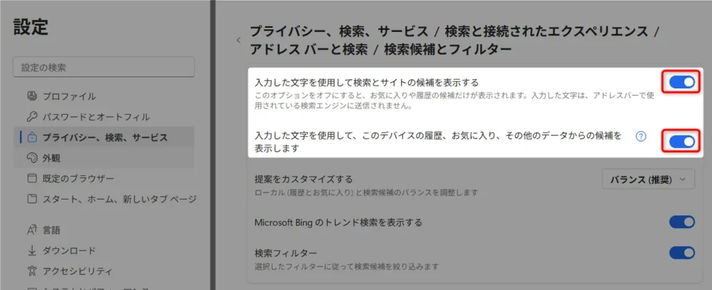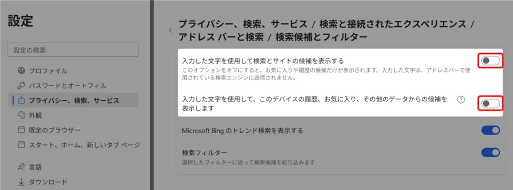もしこの後、Edgeのオートコンプリート機能を有効にしたい場合は、先ほどオフにしたスライドバーをオンにしてください。