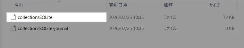 C:\Users\(ユーザー名)\AppData\Local\Microsoft\Edge\User Data\Default\Collections内のSQLiteデータベースファイル(collectionsSQLite)です