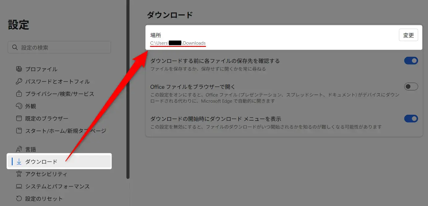 Edgeのダウンロード保存先を変更したい場合は、同じ「ダウンロード」設定画面にある「変更」ボタンをクリックします。