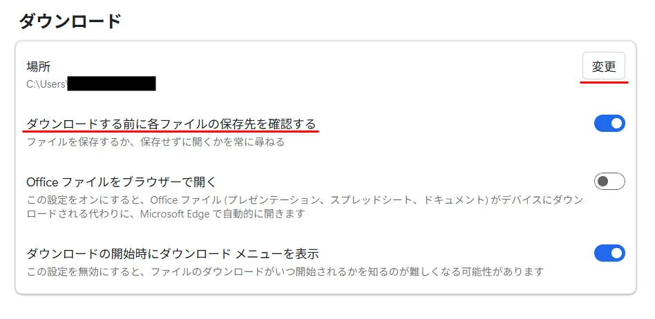 また、「ダウンロードする前に各ファイルの保存先を確認する」をオンにすると、毎回保存場所を指定できるため、用途別に管理したい人におすすめです。