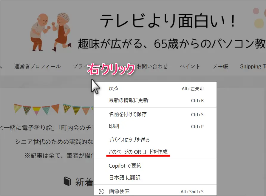 サイト上の任意の場所で右クリックして、メニューの中から「このページのQRコードを作成」を選択しましょう。