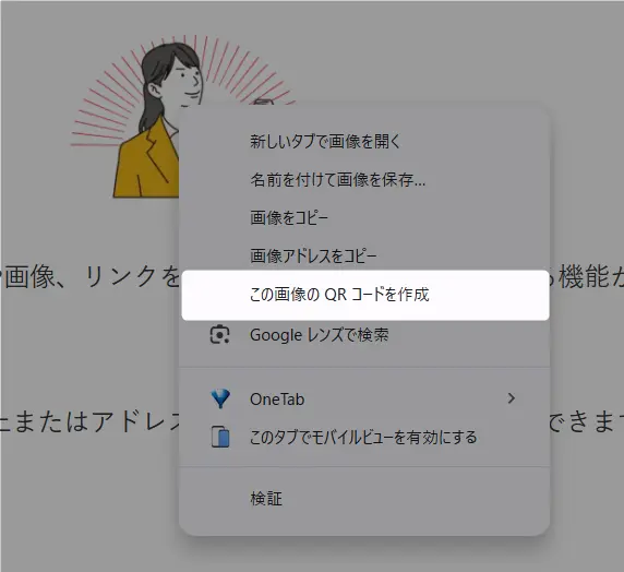画像や特定リンクだけをQR化したい場合は、リンクや画像の上で右クリックし、「この画像のQRコードを作成」を選びます。