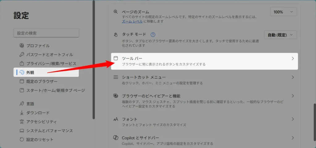 左サイドメニューの「外観」をクリックして、画面中央にある「ツールバー」を選択してください。