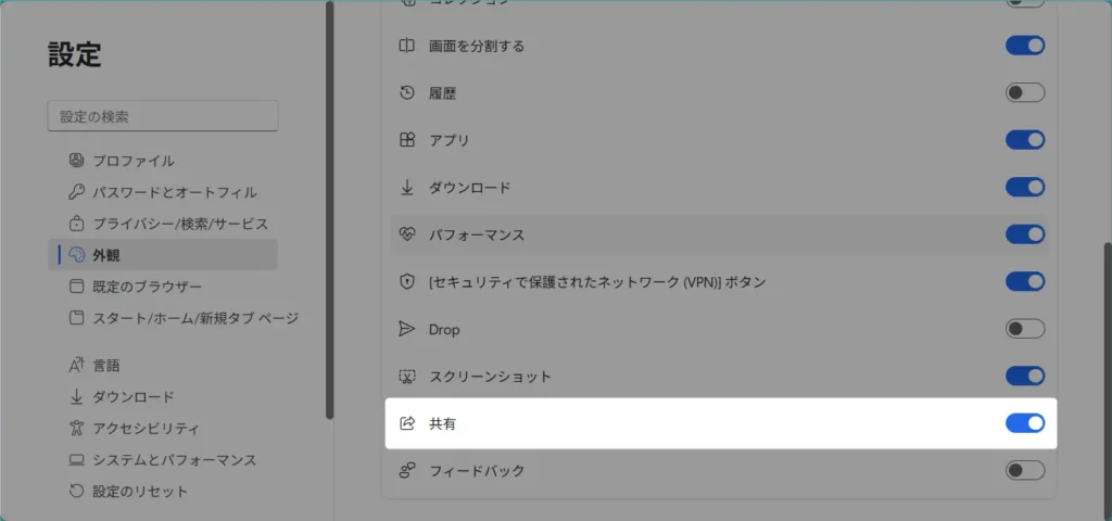 そして、「共有」のスライドバーをONにしましょう。これで下準備は整いました。