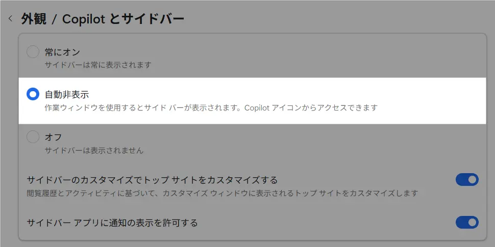 - 「設定」>「サイドバー」>「Copilot」から、右上のアイコンも個別に消せる