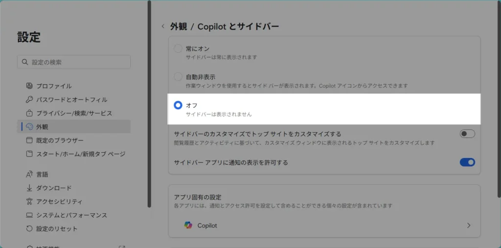 左側のサイドメニューから [外観] をクリックして、画面中央を少し下にスクロールし、[Copilotとサイドバー] セクションを見つけてクリックしてください。