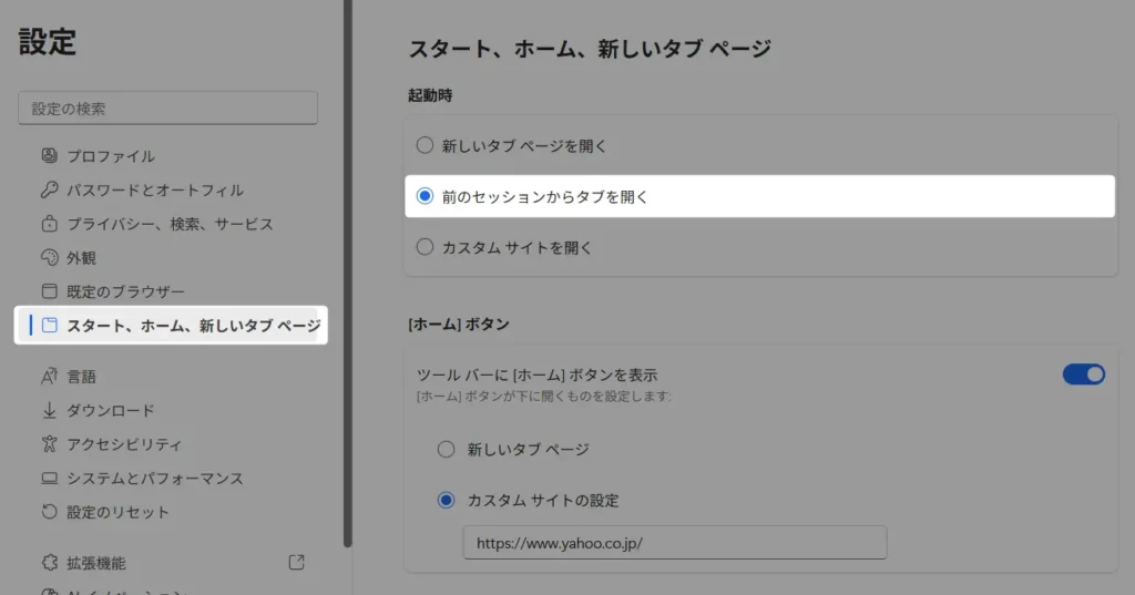 - 前回のセッションからタブを開く:前回ブラウザを閉じたときのタブをすべて復元する設定。