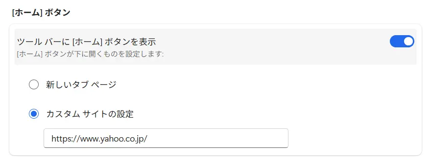 その下に表示される「ホームボタンをクリックしたときに開くページ」で、好みのURL(例:https://www.google.com)を入力すれば完了です。