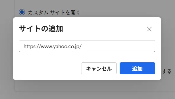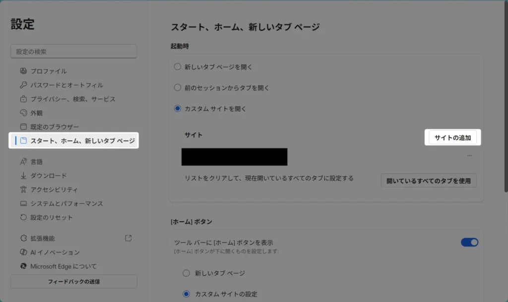 サイドメニュー内の「スタート、ホーム、新しいタブページ」を選択した後、「サイトの追加」をクリックします。