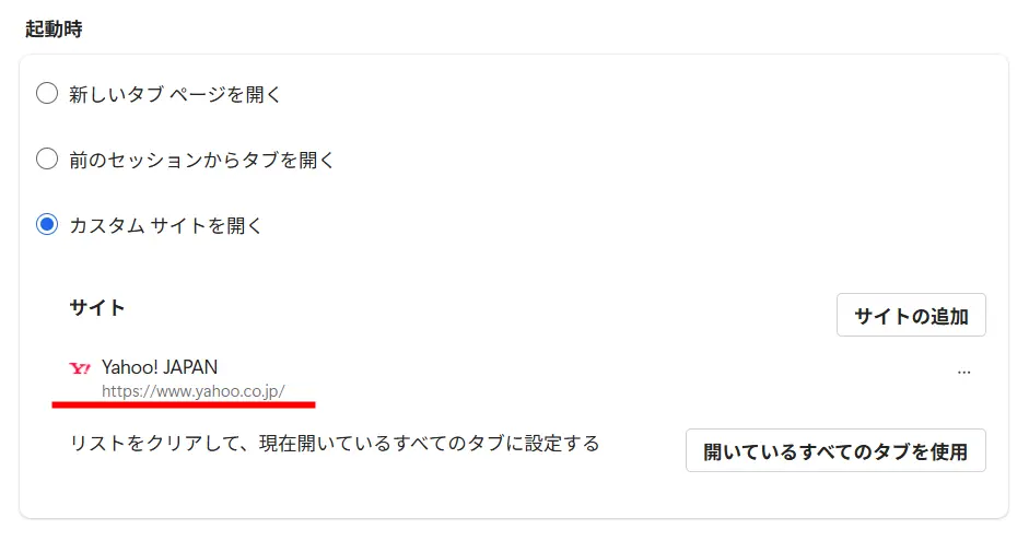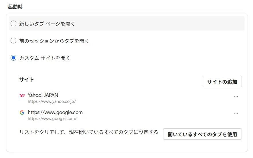 スタートページ(起動時に開くページ)は「設定」→「起動時」から設定します。ここで「新しいタブ」「前回のセッション」「これらのページを開く」から選択できます。