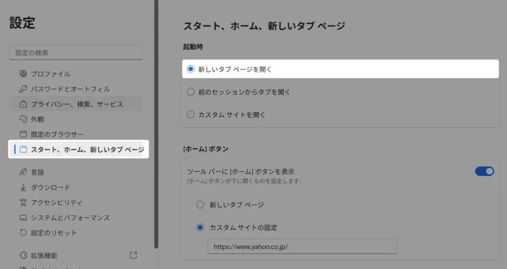 | スタートページ | Edgeを起動した直後 | 起動時の表示内容を設定する。 |