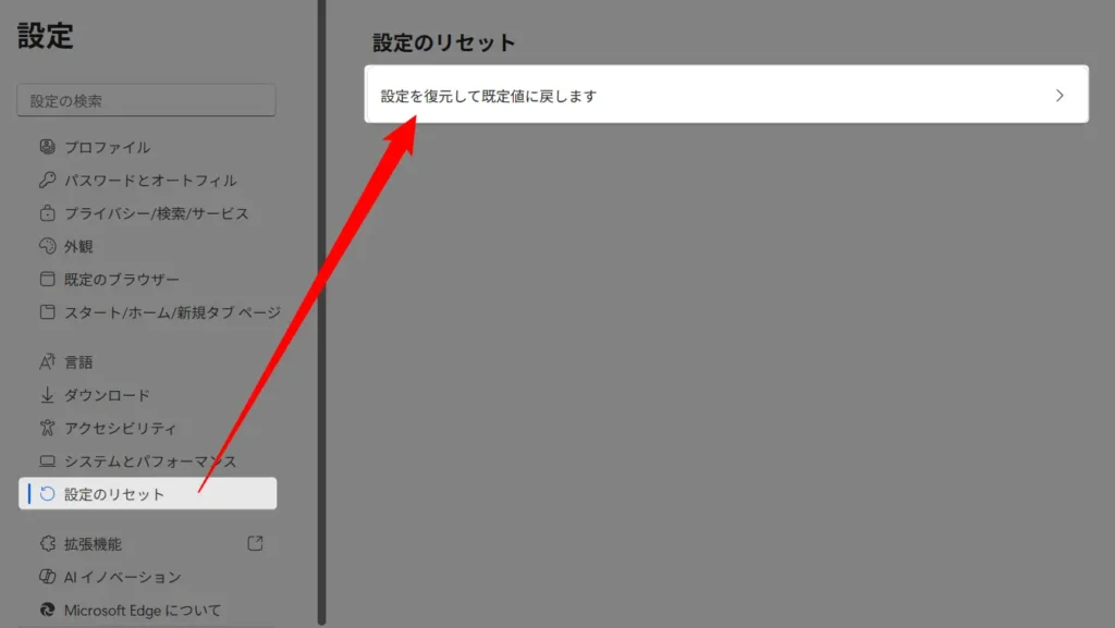 左メニューの「設定のリセット」を選択して、画面中央の「設定を復元して規定値に戻します」をクリックしましょう。