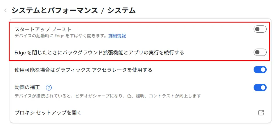 一方、「スタートアップ ブースト」は、Edgeを素早く使えるようにバックグラウンドで常駐させる機能です。