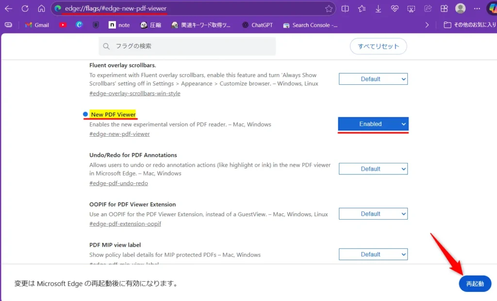まう、Edgeのアドレスバーに edge://flags/#edge-new-pdf-viewer と入力してください(そのままコピペ推奨)。