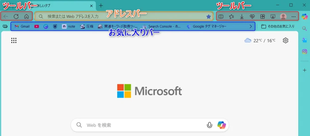 上図のとおり、「ツールバー」は「アドレスバー」の両端にあり、「お気に入りバー」は「アドレスバー」の下にあります。