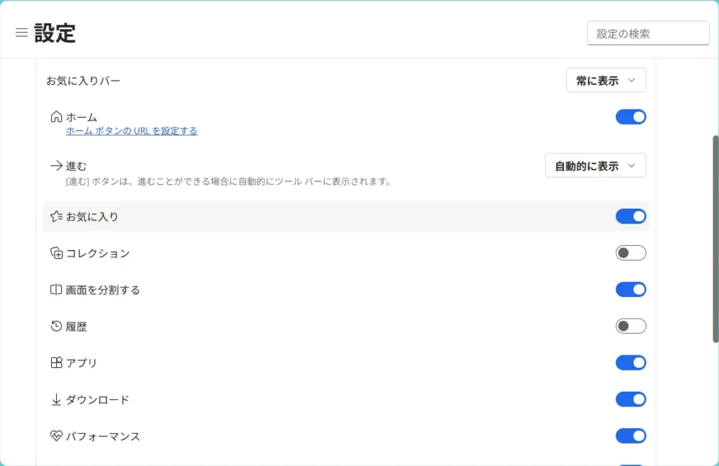 - Edgeでツールバーを常に表示する設定が見つかりません。
