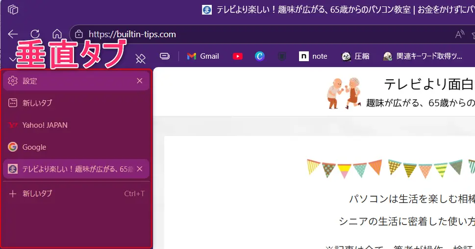 Edgeの垂直タブは、Microsoft Edgeに標準搭載されているタブ表示機能のひとつで、従来の横並びタブを左側に縦表示できるのが特徴です。
