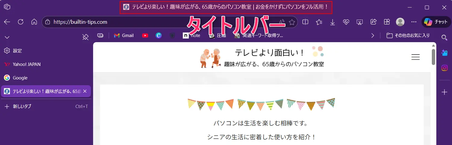 ちなみに、上から二番目の[垂直タブでタイトルバーを非表示にする]の「タイトルバー」とは、下図をご覧ください。
