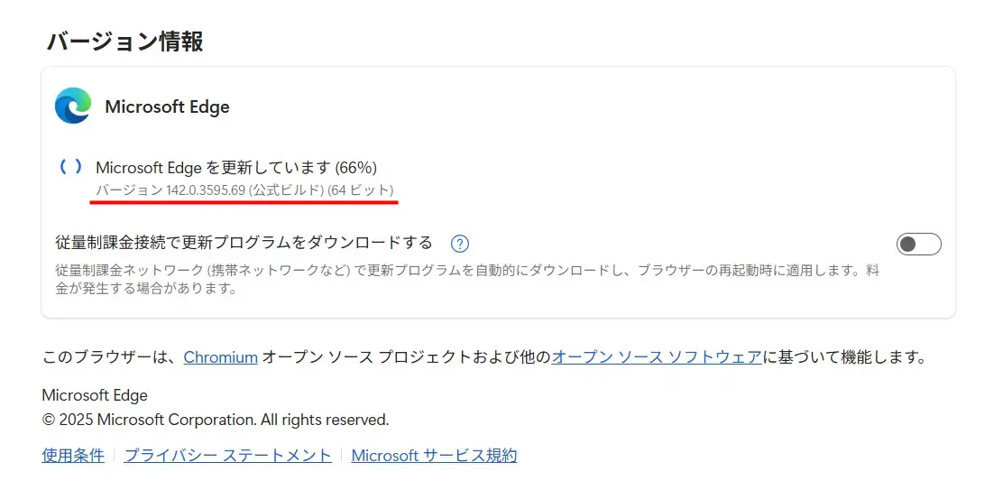 これだけで、Edgeのバージョン確認とアップデート方法は完了です。