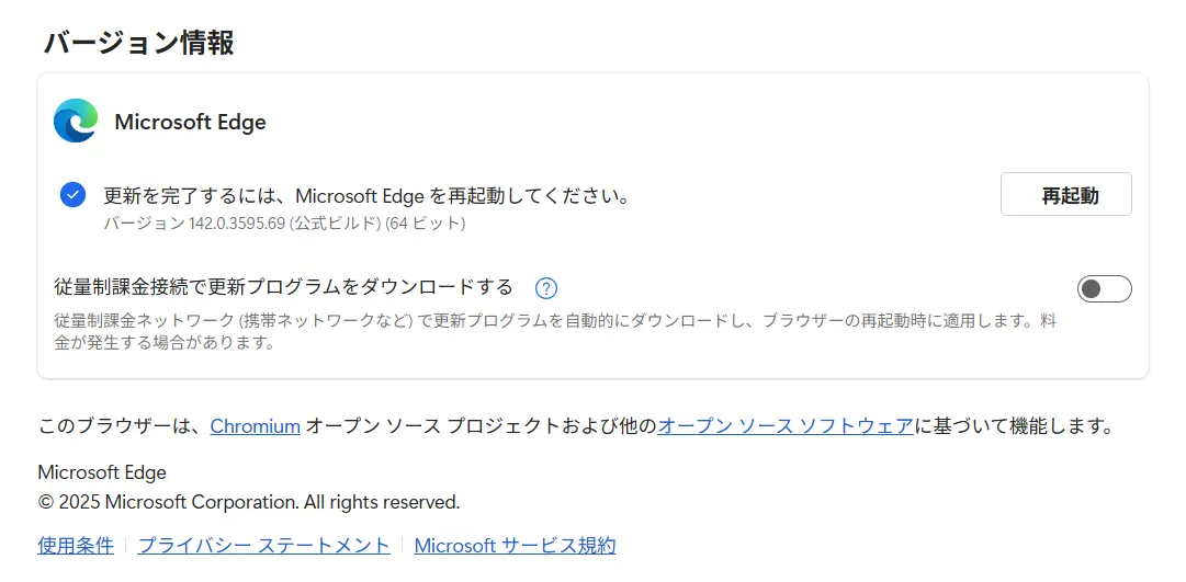 - Edgeを再起動してから再度「Microsoft Edge について」を開く