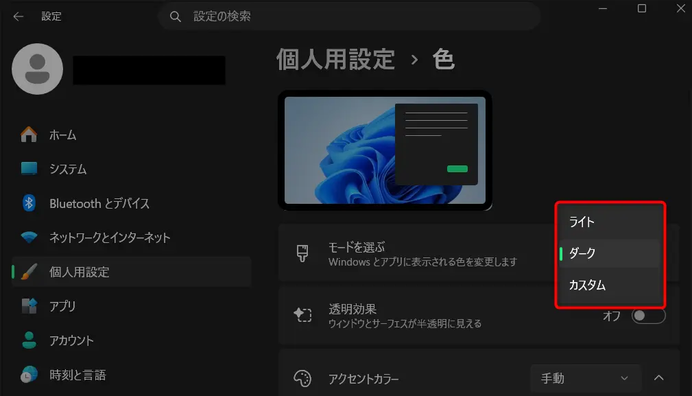 手順②:モードをダークまたはカスタムに変更
