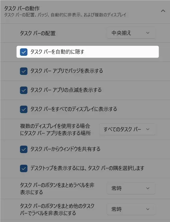 「設定」→「個人用設定」→「タスクバー」→「タスクバーの動作」と進むことで確認できます。