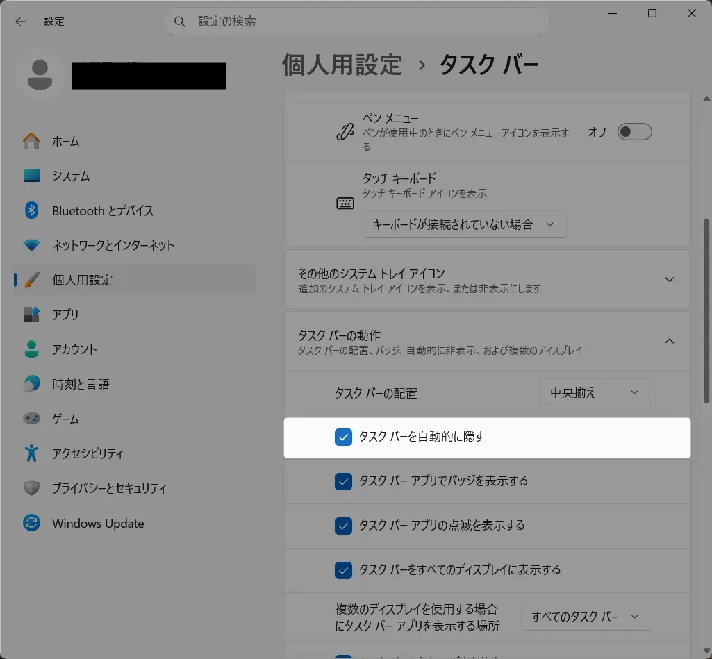 Windows 11 タスクバーを隠す機能は、「自動的に隠す設定」によって動いています。