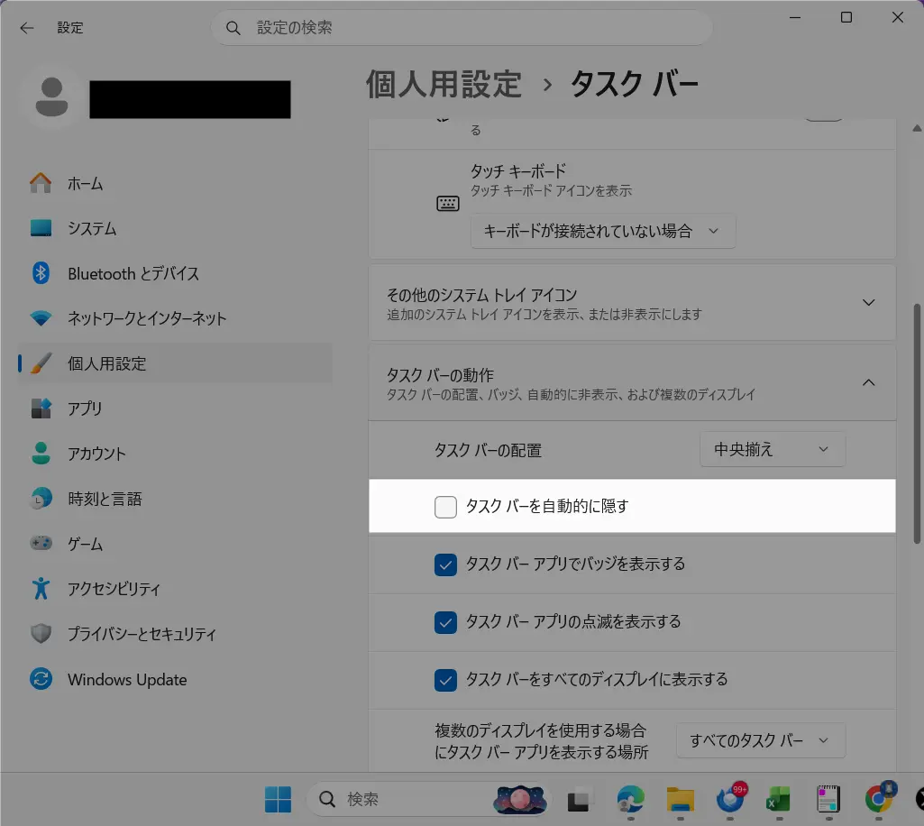 - Windows 11のタスクバーを隠す手順