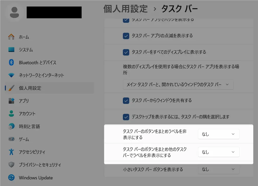 Windows 11 タスクバーを結合しないのであれば、上図のように、[タスクバーのボタンをまとめラベルを非表示にする][タスクバーのボタンをまとめ他のタスクバーでラベルを非表示にする]をなしにするのが最も理想的といえます。
