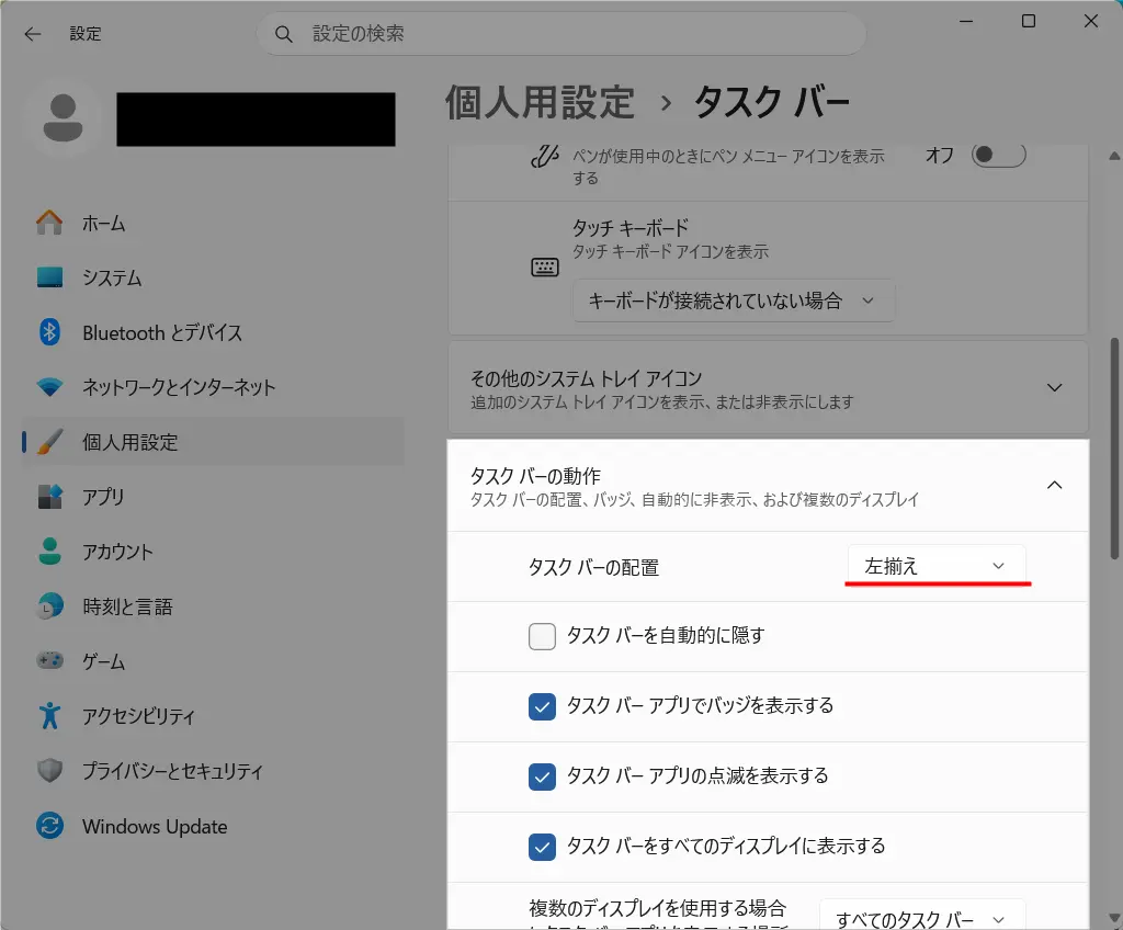 設定画面からタスクバーを左寄せにする手順