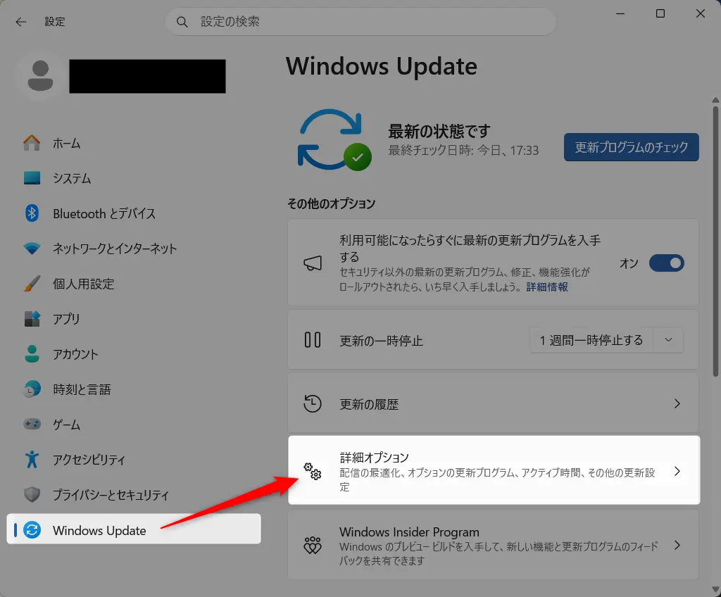 まず、[設定] > [Windows Update] > [詳細オプション]をクリック