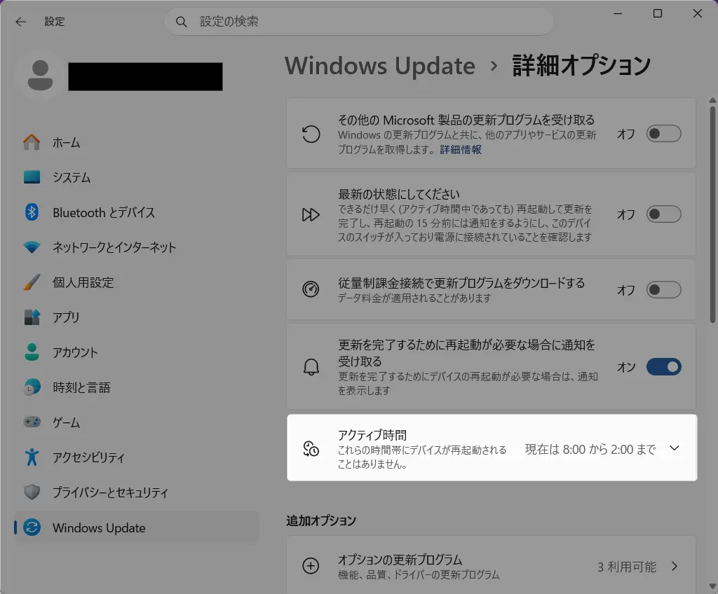 自動更新による再起動を防ぐためには[アクティブ時間]の設定が有効です。これは「作業している時間帯には再起動しない」ようにする機能です。