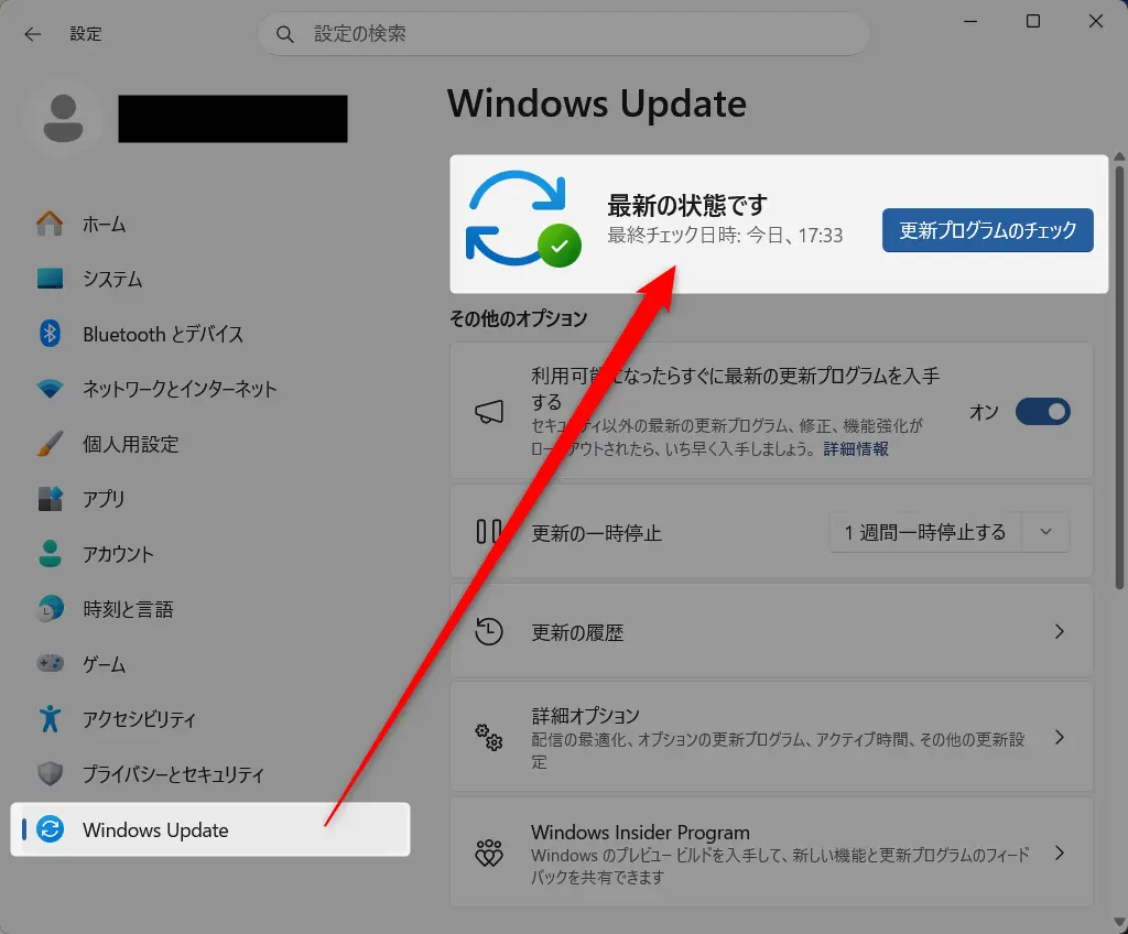 設定画面サイドメニューの[Windows Update]を選択を開き、下図のように[最新の状態です]と表示されていれば問題ありません。