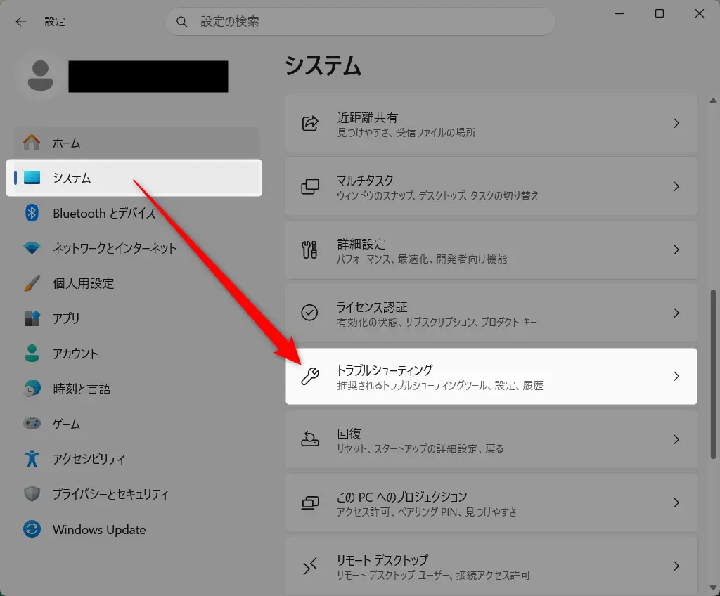 [設定] > [システム] > [トラブルシューティング]から実行できます。