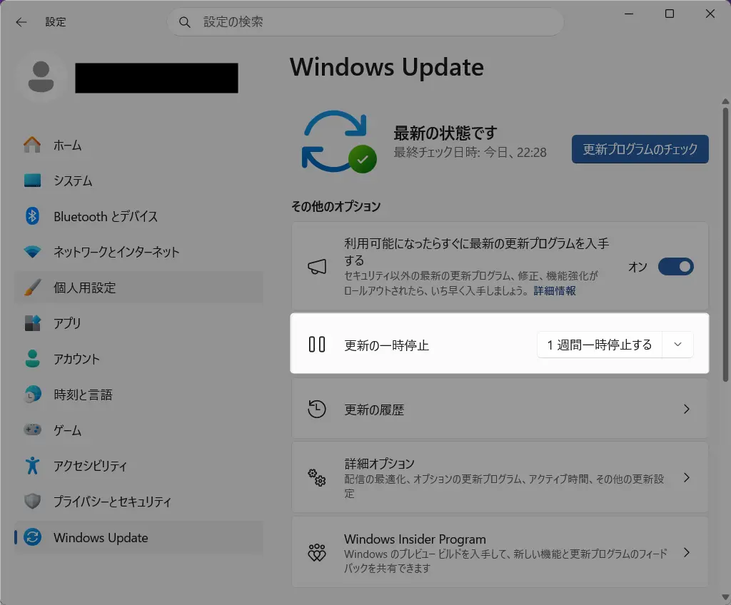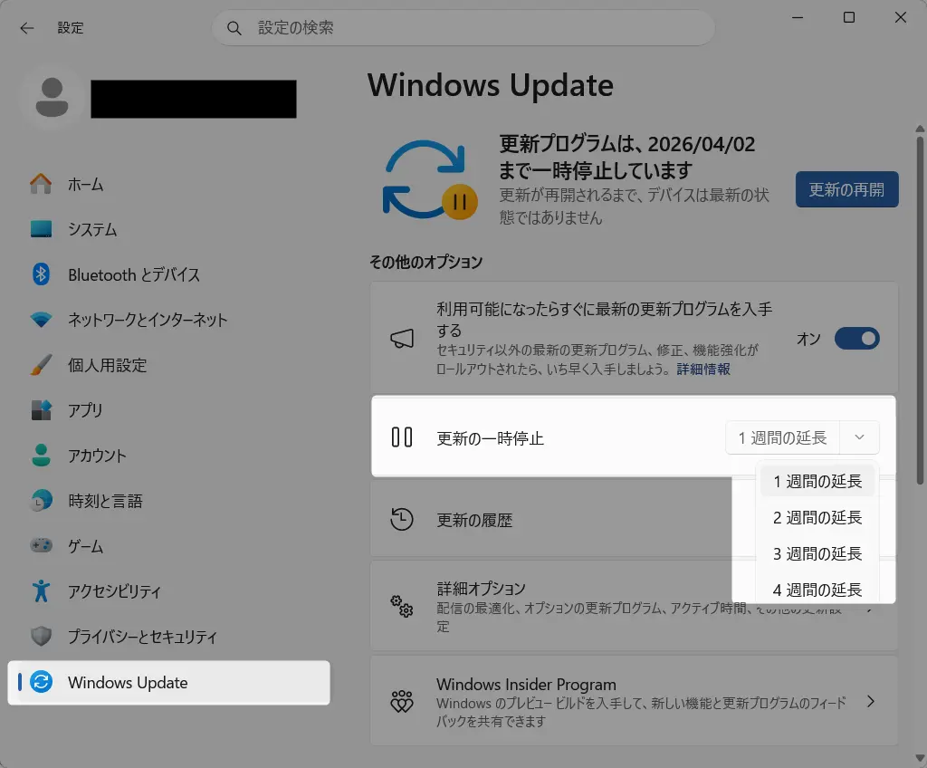 通常は自動更新がオンになっていますが、[更新の一時停止]機能を使うことで一定期間オフにすることも可能です。